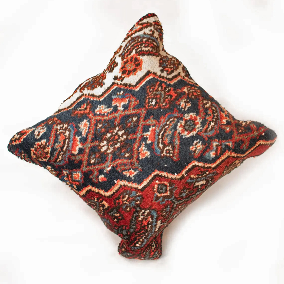 This handmade Persian rug pillow carries the soul of Hosseinabad—where tribal weavers tie stories, memories, and mountain winds into every knot. Deep reds and midnight blues bring a grounding, protective energy to your home, turning any corner into a warm, creative sanctuary. More than a cushion—it’s a fragment of heritage, a whisper of nomadic freedom, a small piece of Persia that makes your space feel alive.